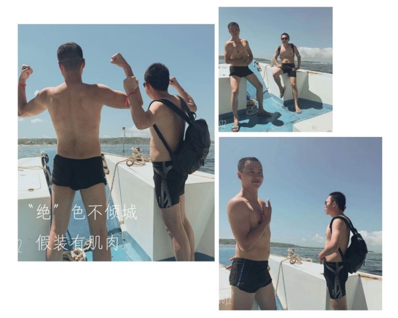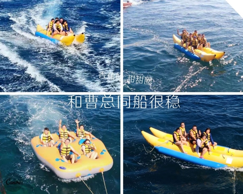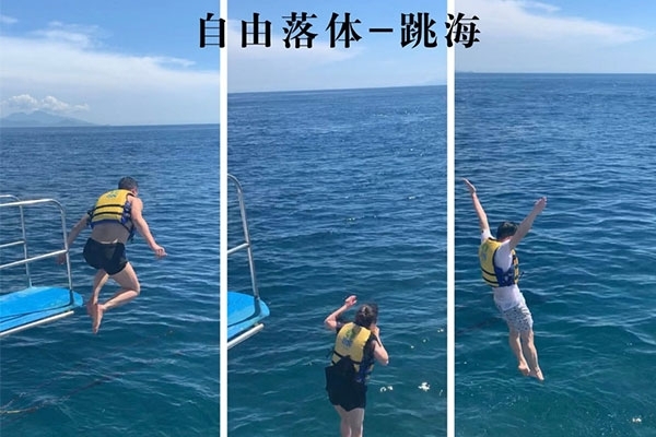 半小時(shí)后,我們首先到達(dá)了海中間由兩艘游輪搭建的漂浮“海上游玩基地”,除了“香蕉船”“甜甜圈”和“浮潛”這些項(xiàng)目,最有意思的是“跳?!?,作為非專業(yè)隊(duì)員,大家入水姿勢(shì)各異,激起巨大的浪花。遺憾的是,“女神”曹總并沒有參與“跳?!?,估計(jì)她是為大家著想,怕入水海平面升高2米,淹沒“基地”,多年以后,我還是要感謝曹總的“不淹之恩”,讓我依然可以坐在在夕陽下回憶往昔。
