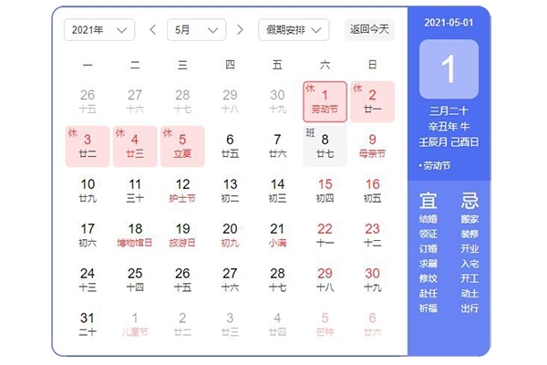 2021年5月1日-5月5日放假調(diào)休,共5天。5月8日(星期六)我們正常上班。節(jié)前各位同事安排好工作,配合行政做好清潔打掃工作,檢查好電源開關(guān),關(guān)好門窗。節(jié)日期間,請大家注意人身安全和財(cái)產(chǎn)安全,愉快的度過假期。